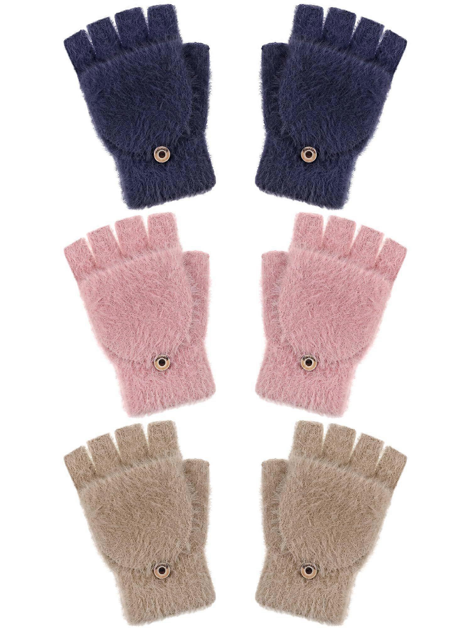 3 Pairs Kids Fingerless Gloves Winter Flip Gloves Warm Convertible Mitten for Girls Teenager Half Fingerless Mittens