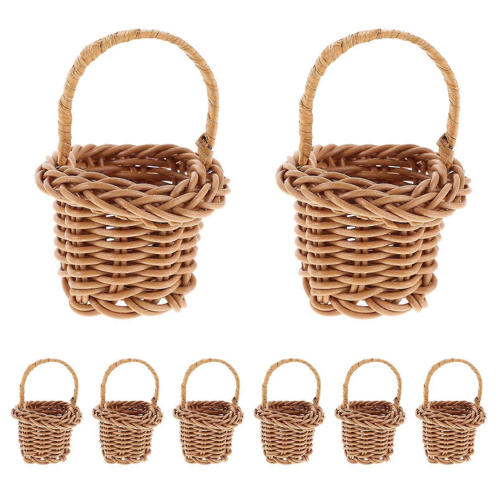 Description Handcrafted with natural rattan, the mini woven flower basket serves as a beautiful accent for any living space. This tiny dollhouse accessory is fit for desktop basket decor or dollhouse mini storage basket, keeping small items organized. Its airy structure protects contents from moisture, making it ideal for flower harvest or storing tiny miniature rattan baskets. Features -Color:Light Brown -Material:Rattan -Size:8.00X6.00X5.50cm/3.14X2.36X2.16in -Handcrafted elegance: each mini woven flower basket boasts handwoven craftsmanship, adding a refined touch to your dollhouse decorations while infusing your space with artistry -fit organization: the tiny dollhouse basket design is ideal for desktop storage, keeping small items organized in your living room, bedroom, or dollhouse mini accessories collection -Natural material freshness: made from sturdy natural rattan, this miniature rattan woven basket offers excellent breathability, ensuring your fruit or flower harvest stays fresh and moisturefree -Versatile use: use as a doll house accessories piece, fairy garden basket, or wedding flower baskets, meeting various decorative and practical storage needs in one mini storage basket -Easy maintenance: the mini hand woven basket is uniquely designed for effortless cleaning, so your dollhouse woven baskets stay beautiful, extending durability and reducing the need for frequent replacementsPackage list: 8 x mini rattan baskets