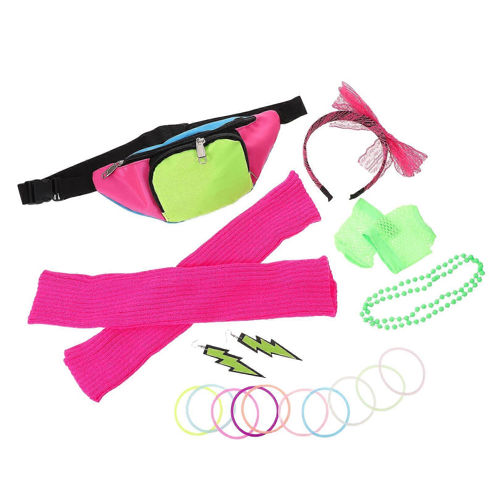 19pcs Neon Costume Accessories: 80s Neon Outfit Jewelry Set for Women -Includes Fanny Pack Earrings Headband Leg Warmers Wristbands & Bracelets