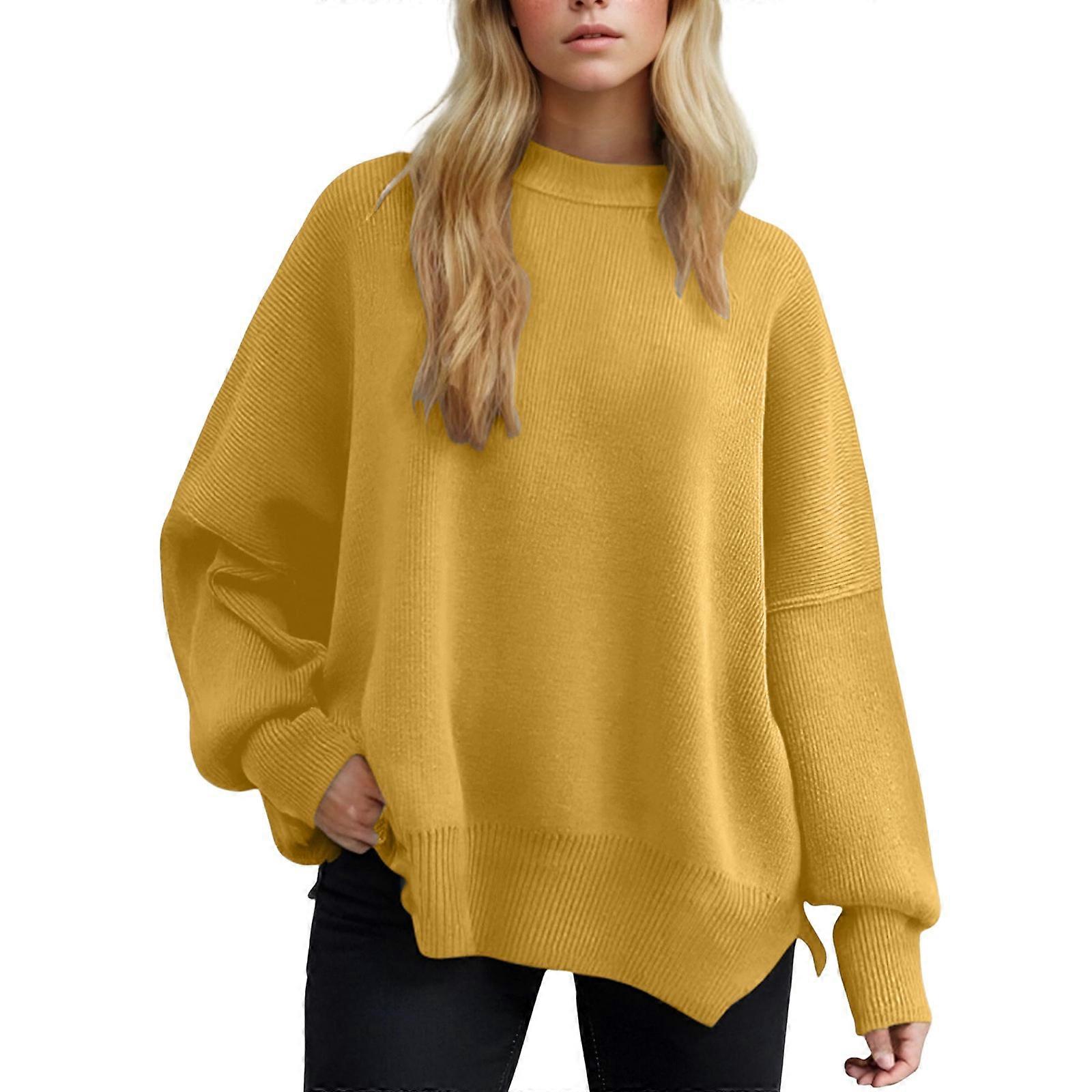 Women's Polyester Round Neck Long Sleeve Sweater Batwings Sleeve Design Side Slit Loose Fit Oversized Solid Color Yellow XL