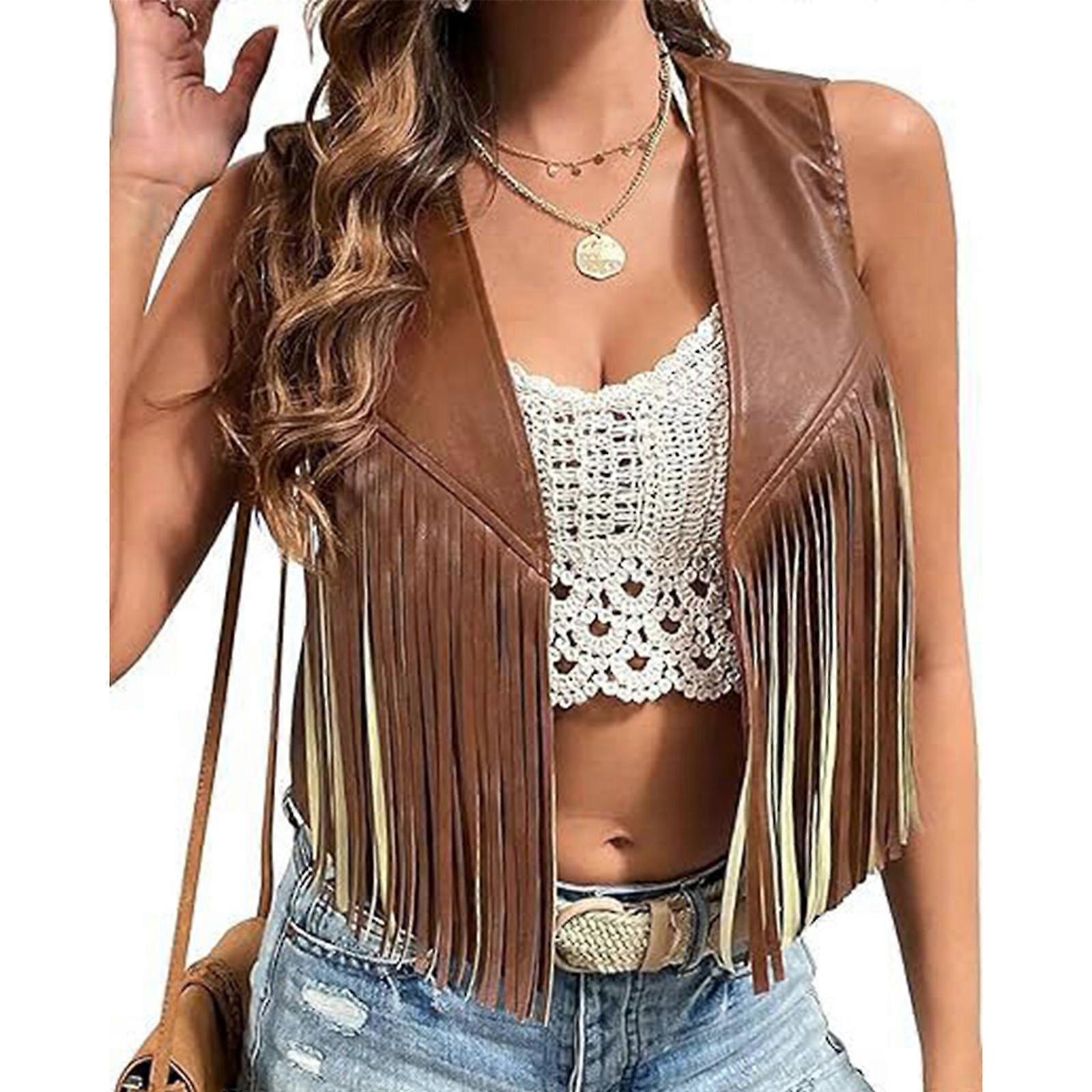 Women's Tassels Sleeveless Vest 70s Hippie Outfit Fringe Cropped Jacket Faux Leather Open Front Cardigan Cowgirl Tops brown XL