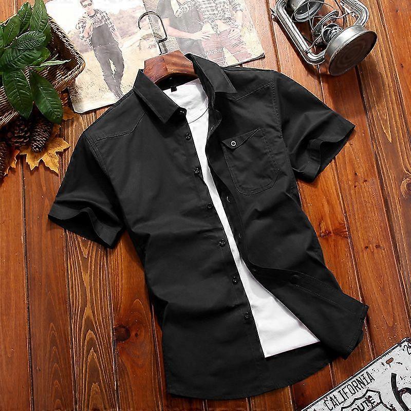 Men's Pure Cotton Solid-Color Shirt, Short-Sleeved, Fashionable And Versatile For Teenagers, Slim And Military-Style, Military Green Short-Sleeved Top
