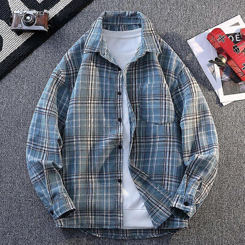 American Style Retro Trendy Plaid Shirt Men's Spring And Autumn Casual Loose High-Grade Blue Plaid Shirt Jacket