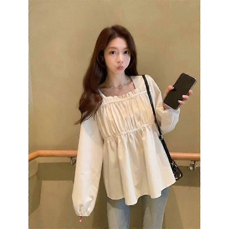 Square Collar Pleated Long-Sleeved Shirt Women's Autumn Design Sense Loose Belly Covering Top Fashionable