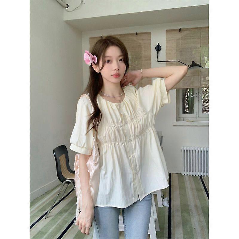 Large Size Short Sleeve Shirt Summer Round Neck Shoulder Puff Sleeve Belly Covering Top For Chubby Girls