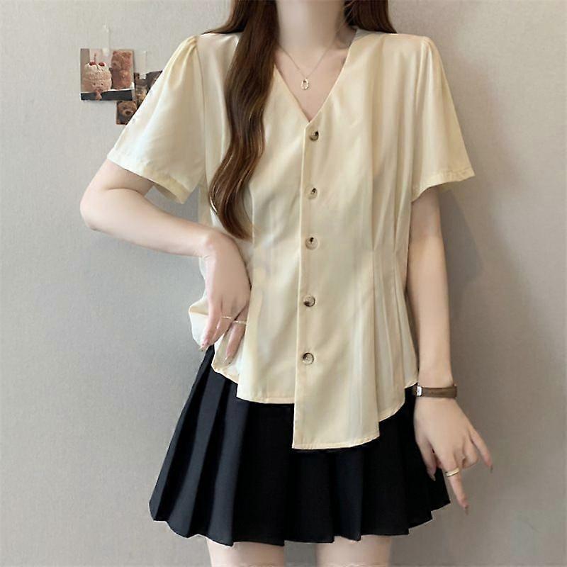 V-Neck Irregular Shoulder Short-Sleeved Shirt Women's Summer Belly-Covering Slimming Top