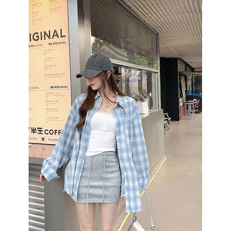 Blue Checkered Shirt Women's Spring/Autumn Lazy Style Loose Fit Versatile Casual Shirt Small Size Coat