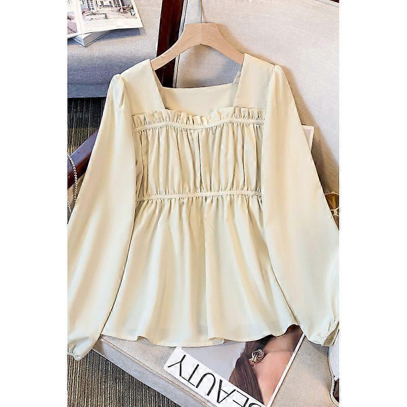 Square Collar Pleated Long-Sleeved Shirt Women's Autumn Design Sense Loose Belly Covering Top Fashionable