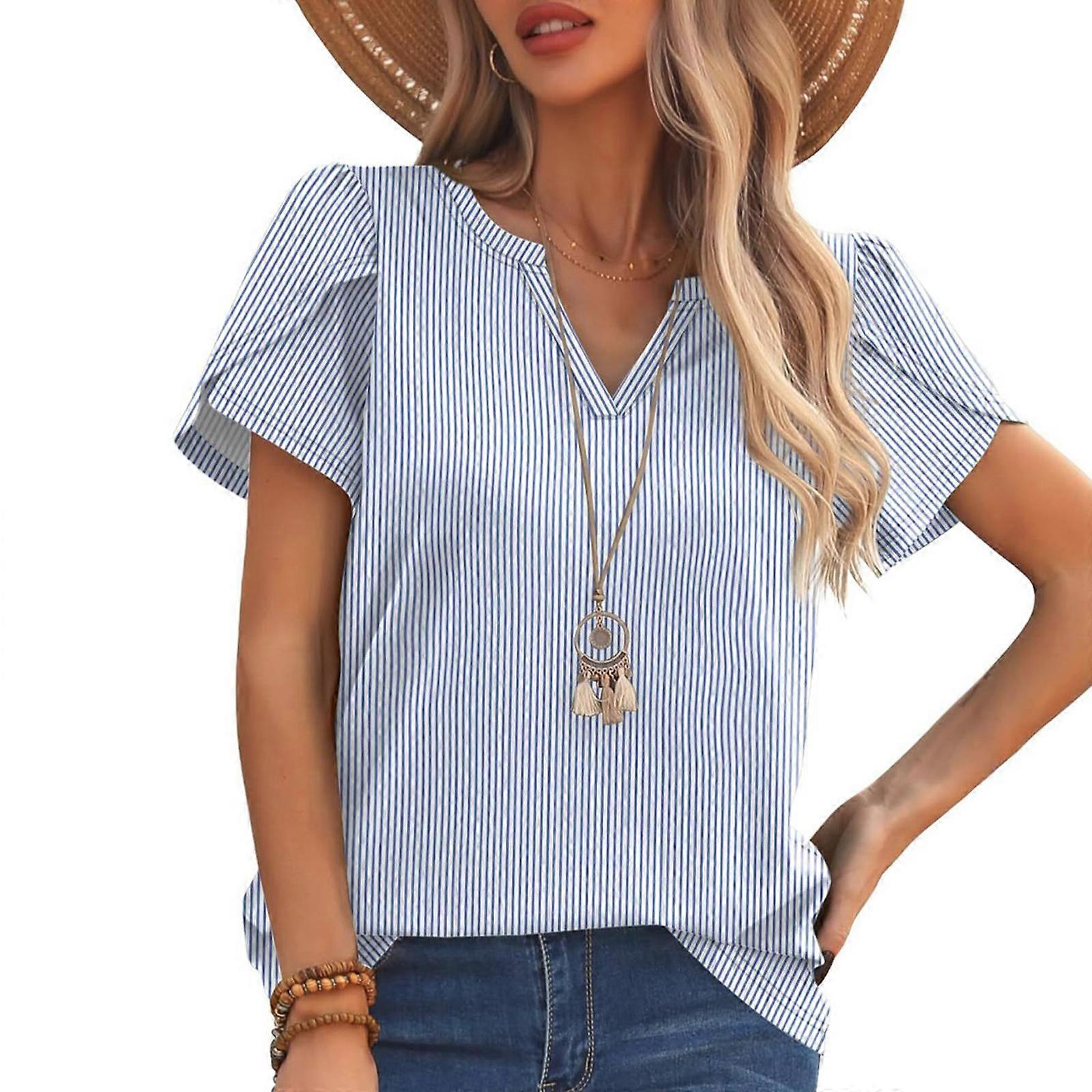 Lightweight Women's V Neck T-Shirt Blouse Colorful Floral Print Petal Short Sleeve Tunics Tee Top for Casual Going Out blue and white pinst XL