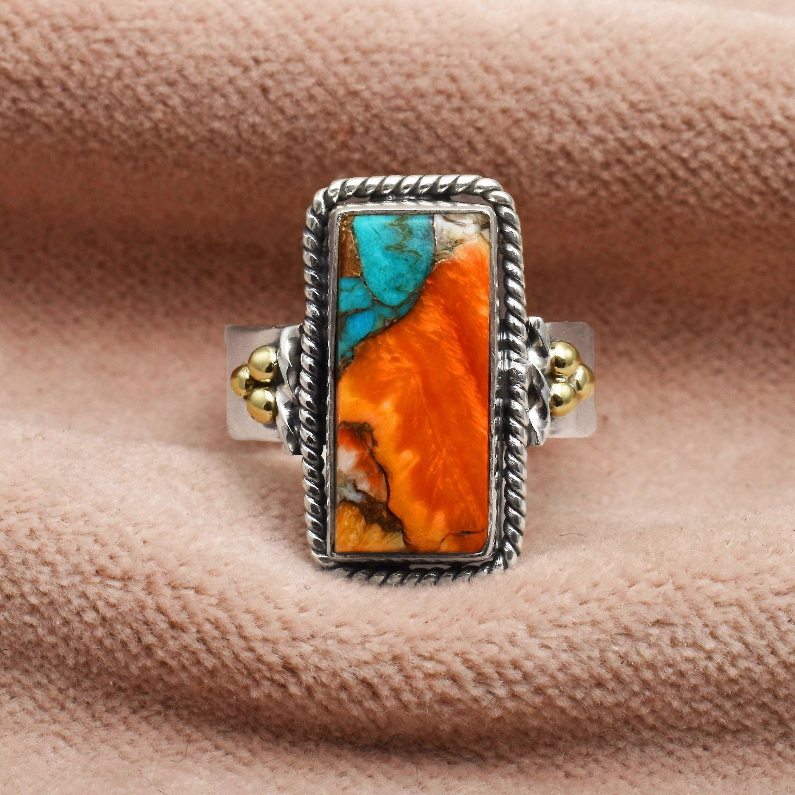 Two-Tone Spiny Oyster Turquoise Gemstone Handmade Solid 925 Sterling Silver Designer Ring Jewelry Gift For Her