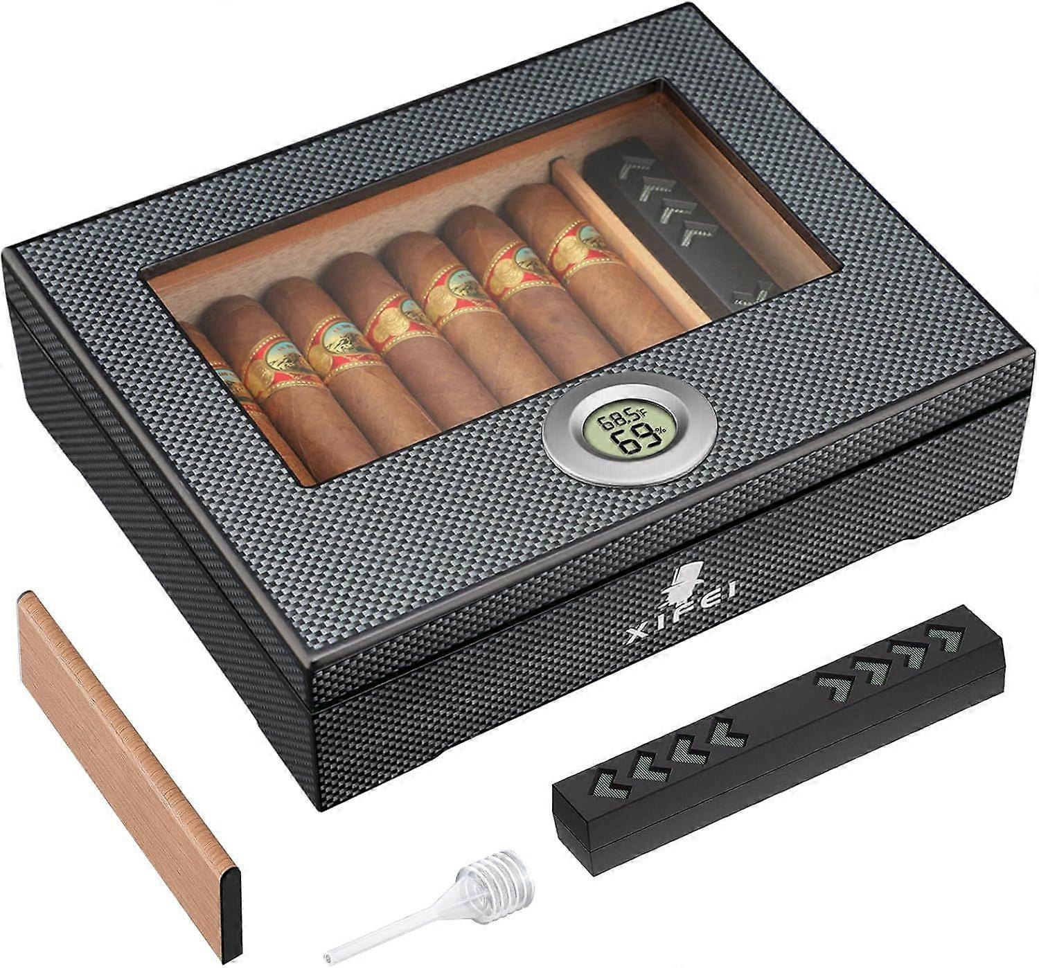 Cigar Humidor, Glass Top Carbon Fiber Texture with Digital Hygrometer, Including