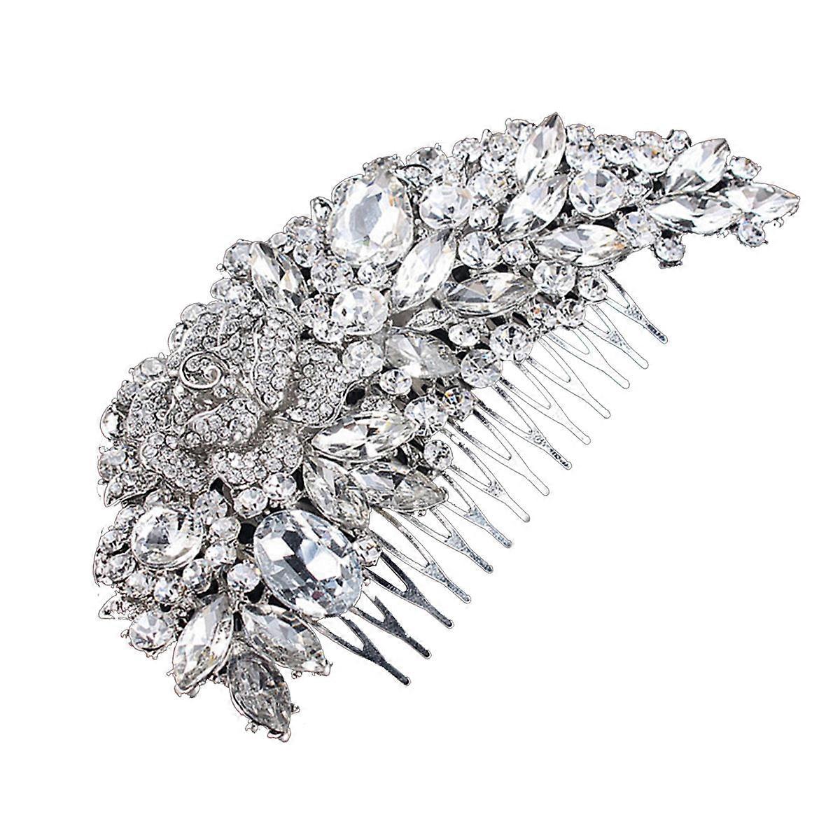Bridal Hair Comb Silver Crystal Rhinestones Decor Flower Style