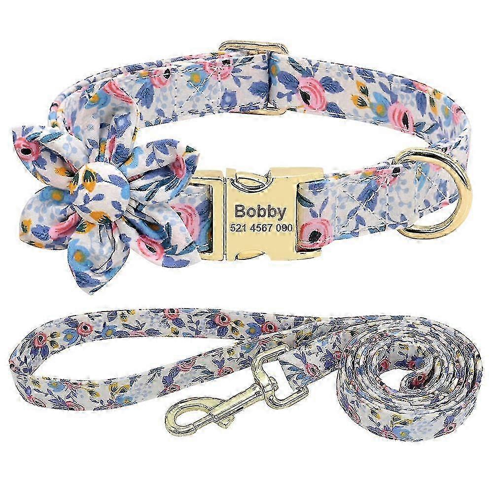 Custom engraved dog collar with leash nylon printed dog id collars pet walking belt for small medium large dogs flower accessory 26-27s