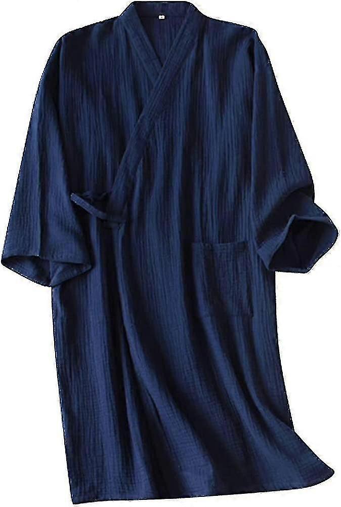 26-27 Men's Kimono Robes Cotton Dressing Gown Khan Steamed Clothing Bathrobes Long Sleeve Sleepwear Loungewear Nightwear. Navy