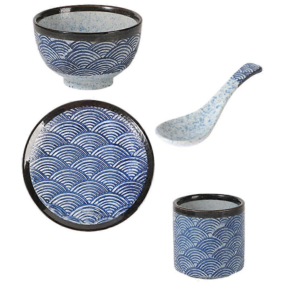 This is a set of Japanese style tableware set, made of ceramic material. Our tableware set is more resistant to cracks, stains, and scratches, very practical. Can be the perfect gift for your friends who will be happy for this set. Features -Color:Dark Blue -Material:Ceramic -Size:17.50X17.50X2.00cm/6.88X6.88X0.79in (Plate) -Size:11.00X11.00X7.00cm/4.32X4.32X2.75in (Bowl) -Size:7.50X7.50X7.00cm/2.95X2.95X2.75in (Cup) -Size:14.20X4.00X1.00cm/5.58X1.57X0.39in (Spoon) -Artistically handmade, bowl shaped arc beautiful, healthy and comfortable. -High temperature kiln change, kiln change color process, individual texture. -Fired at a high temperature to maximize the strength of the porcelain, making them to other ceramics in the market. -Our tableware set is more resistant to cracks, stains, and scratches, very practical. -Can be the perfect gift for your friends who will be happy for this set. Package list: 1 × bowl 1 × plate 1 × cup 1 × spoon