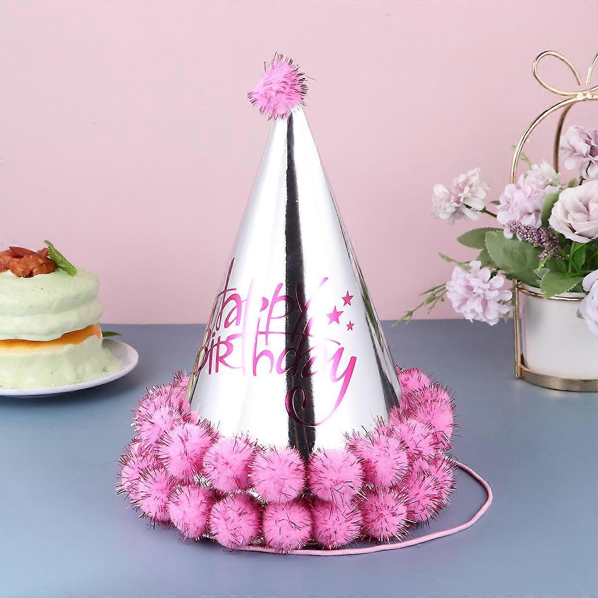Birthday Party Hat Pink Cone Pompon Hat for Birthday Decoration 5Pcs