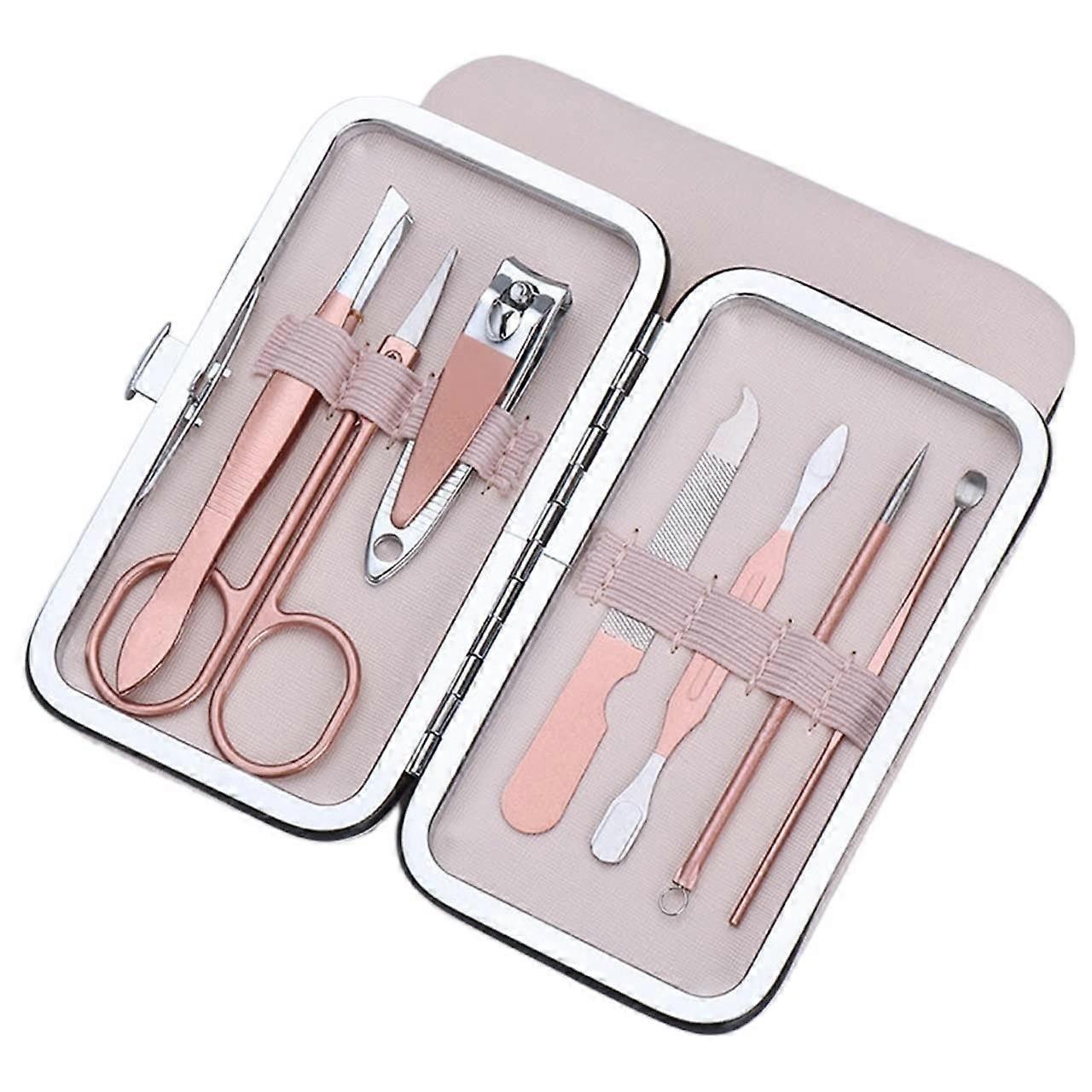 Color: 2 Compact manicure and pedicure set designed for facial care, hand care, and foot care. Brand and thoughtfully organized, the set includes a full range of tools stored in a protective leather case to reduce wear and keep each component in place. Key benefits Allinone solution for grooming needs: contains tools for facial, hand, and foot care so you have the right instrument for trimming, shaping, and tidying nails and cuticles. Durable materials: tools are made of sturdy stainless steel for reliable performance and long life. Corrosion resistant and waterproof: clippers and metal tools resist rust and are easy to rinse and dry after use. Secure, easy storage: leather case with a smooth zipper keeps tools organized and protected, and the zipper opens and closes easily. Lightweight and portable: easy to carry to work, travel, or clients appointments while still suitable for professional salon use and home grooming. Features Includes a selection of manicure and pedicure tools for facial care, hand care, and foot care. Sturdy stainless steel construction for durability and consistent cutting performance. Sharp clipper blades for clean trims and accurate shaping. Protective leather case to minimize wear on tools and keep everything organized. Smooth zipper for quick access and secure closure. Typical use scenarios Athome grooming: maintain nails and cuticles between salon visits with a compact set that is simple to use and store. Travel and business trips: lightweight case fits easily into luggage or carryon for grooming on the go. Salon touchups and mobile services: durable stainless steel tools and a neat storage case make the set suitable for quick client appointments outside the salon. Practical, portable, and organized, this manicure and pedicure set provides essential tools for routine nail and facial grooming with durable materials and convenient storage.