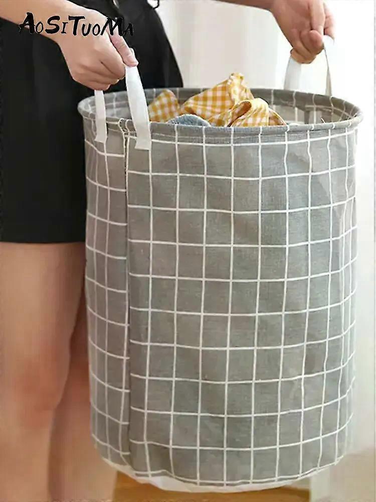 Household Dirty Clothes Basket Toy Storage Bucket Plaid Fabric Cotton Linen Dirty Clothes Basket Large Foldable Waterproof Stora