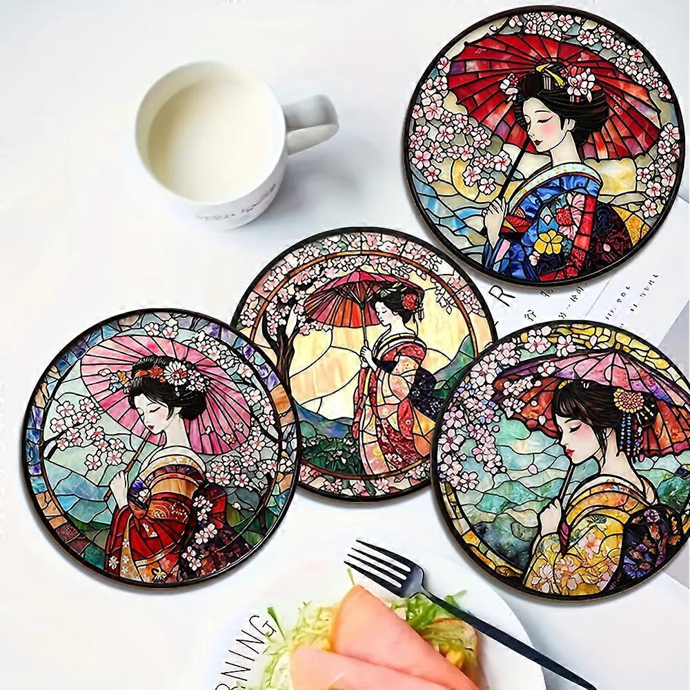 4/6pcs Wooden Coasters Featuring Cherry Blossom Kimono Element Mount Fuji Design Colorful Pattern 2D Coffee Shop Dining Mat Gift