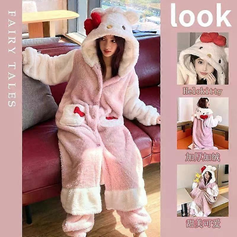Hello Kitty Kawaii Cute Coral Velvet Long Sleeve Hooded Pajamas Pants Home Clothes Dormitory Girls Lovely Wearable Pajamas Set