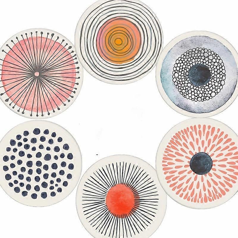 6 pcs 4in Abstract Round Wooden Coasters Heat Resistant Non-slip Drink Cafe Decoration 2D FLat Color Print Orange Coasters Set