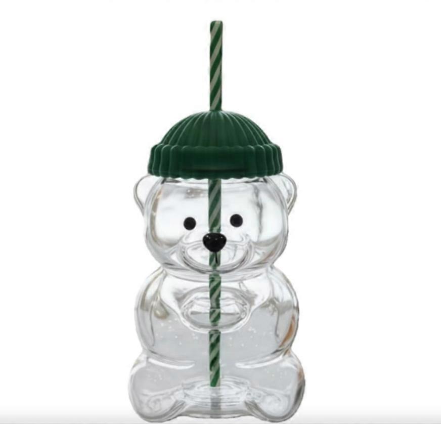 Cute Cartoon Bear Glass Cup 500ML Green Textured Cap Striped Straw Heat Resistant For Daily Hot Coffee Tea Drinks