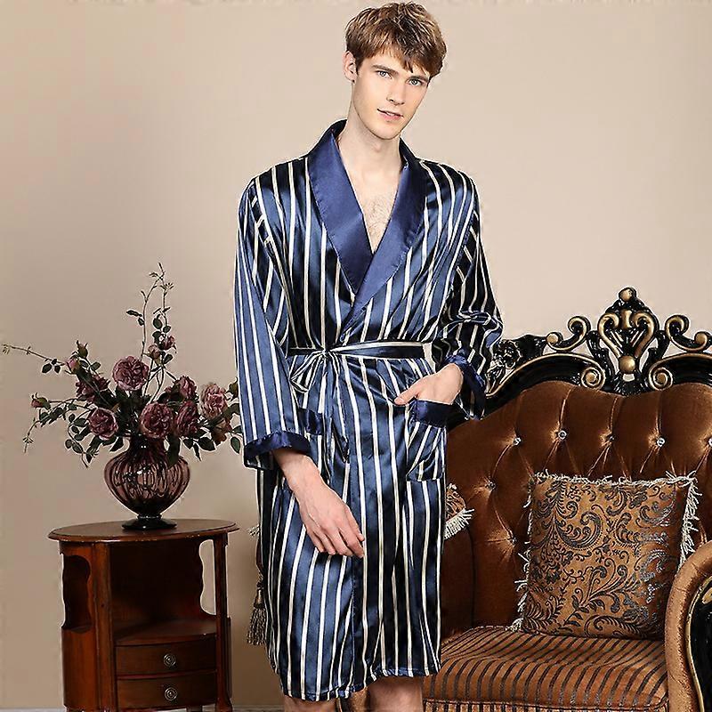 Plus Size 3XL 4XL 5XL Men Robe Sleepwear Navy Blue Stripe Kimono Bathrobe Gown with Pocket Summer Satin Home Clothes Lounge Wear