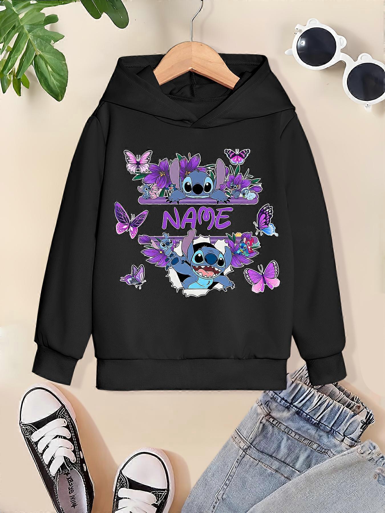 Stitch Girls Hoodie - Customizable Text Hooded Pullover with Butterfly Floral Design Pink Cartoon Print Warm Machine-Washable