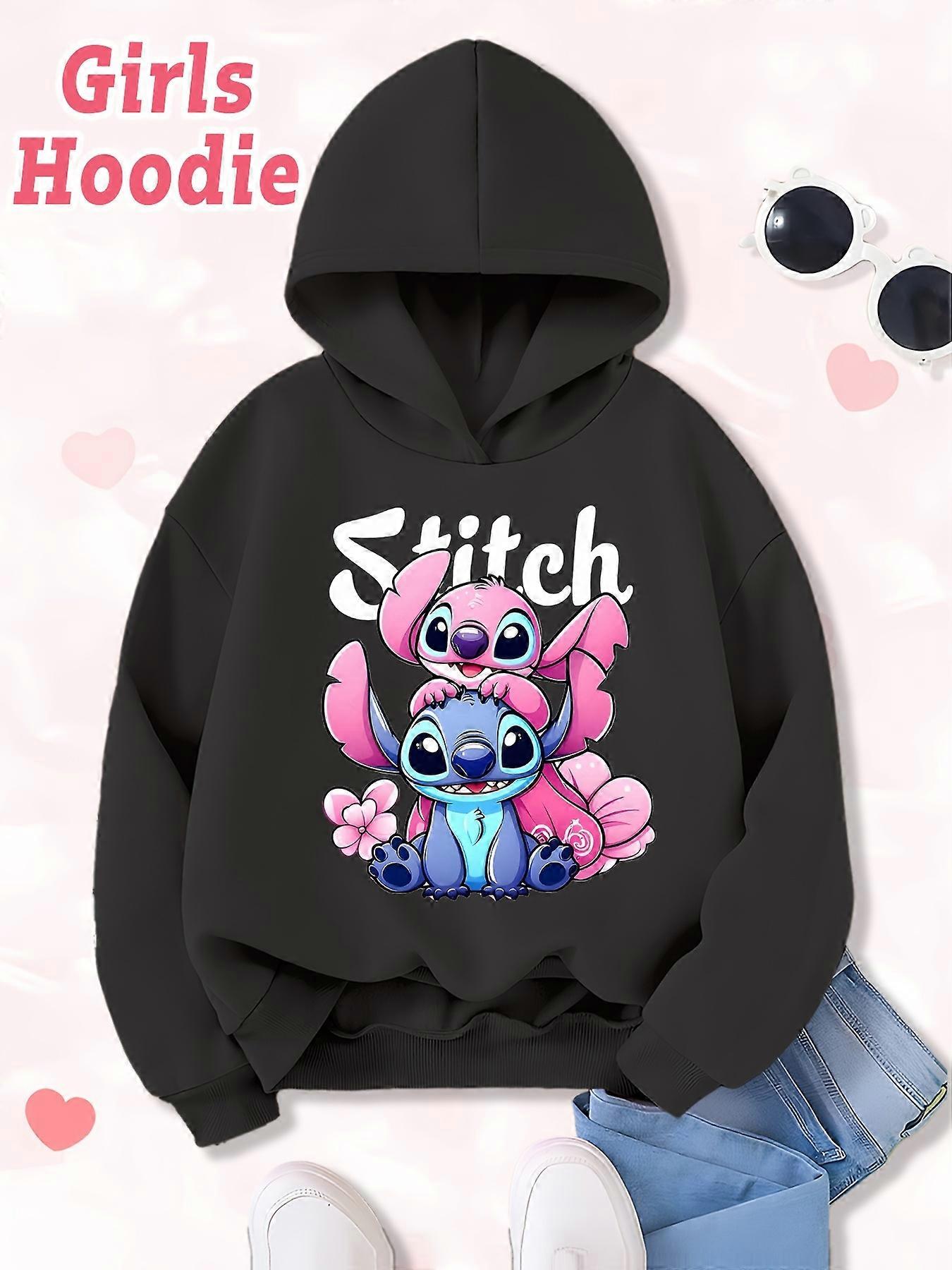 Stitch Lilo Graphic Girls Hoodie - Vibrant Red Pullover with Heart Design Cozy Fleece-Lined Hooded Sweatshirt for Autumn/Winter