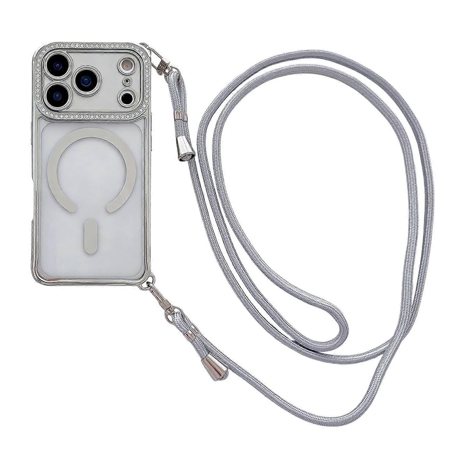 Rhinestone Clear Acrylic Electroplated Magnetic Phone Case with Right-Side Crossbody Lanyard