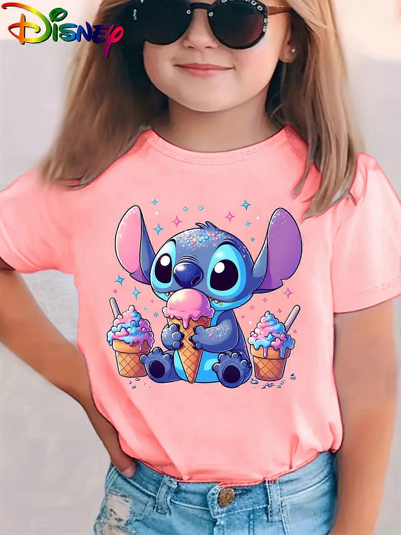 [Disney Stitch T-Shirt] Disney Stitch Eating Ice Cream Girls' Summer Fashion Short Sleeve T-Shirt | Casual Cartoon Print Top