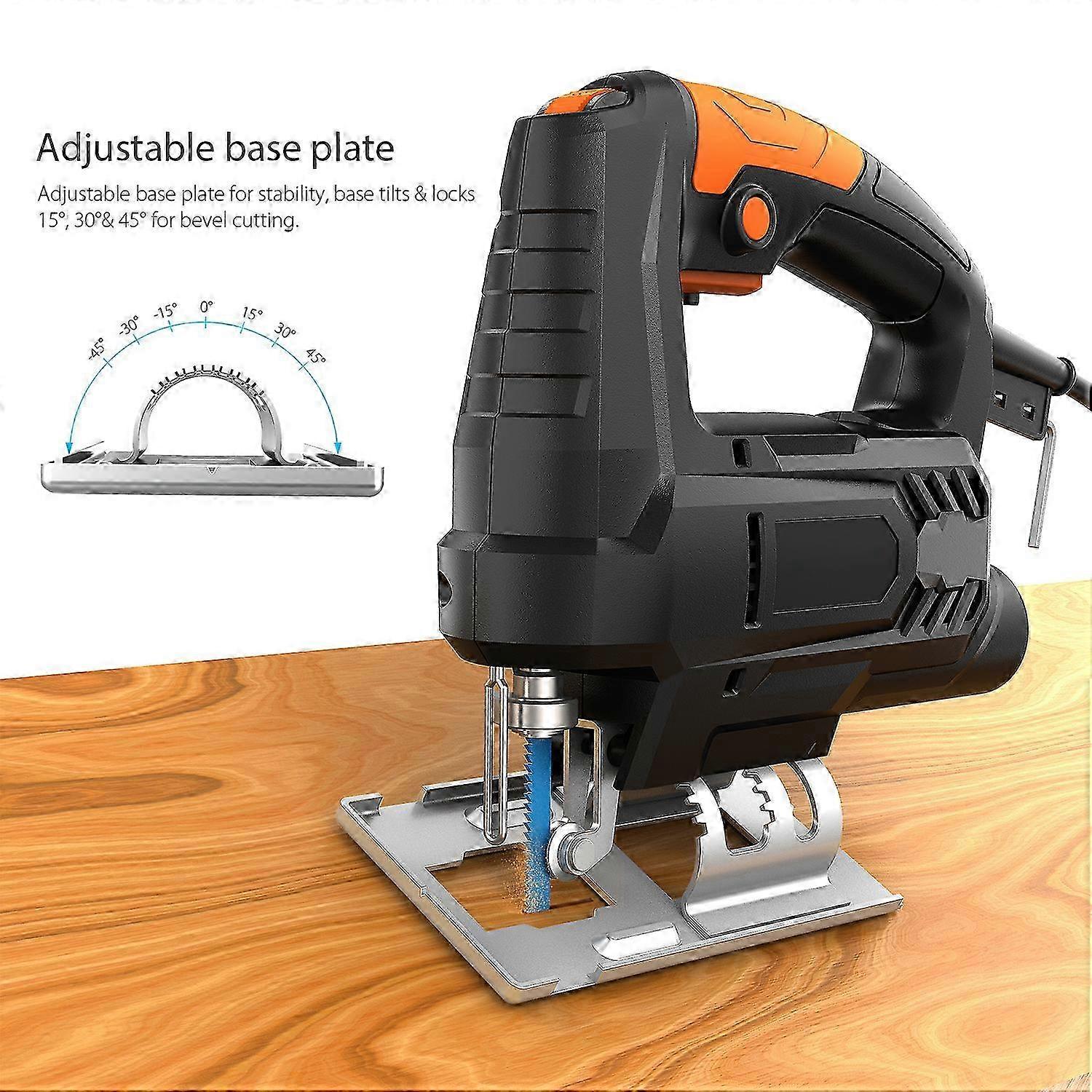 1、3.5A motor with 400W max output power, variable-speed motor up to 3000RPM for tough cuttinging jobs. 2、Quick change of blades for high efficient work with toolless sawblade change. 3、Lock-on switch for continuous working and soft grip for added comfort and controlling. 4、Adjustable base plate for stability, base tilts \u0026 locks 15°,30°\u0026 45° for bevel cutting. 5、Widely used for cutting wood, metal, steel, ceramics and panels of plastic or mineral fibre, aluminum and non-ferrous metal. This is a professional electric jig saw with 4pcs wood cutting blades and 4pcs steel cutting blades. Very convenient for all kinds of tough cutting jobs, such as metal cutting, metal grinding, aluminium product cutting, wood cutting, etc. Features: 3.5A motor with large output power, variable-speed motor up to 3000RPM for tough cutting jobs. Quick change of blades for high efficient work with toolless sawblade change. Lock-on switch for continuous working and soft grip for added comfort and controlling. Adjustable base plate for stability, base tilts & locks 15°,30°& 45° for bevel cutting. Widely used for cutting wood, metal, steel, ceramics and panels of plastic or mineral fibre, aluminum and non-ferrous metal. Specifications: Brand Name: Meterk Color: Black Material: Reinforced Nylon + Iron Voltage: 230V-240V Current: 3.5A Power: 400W No Load Speed: 0-3000RPM Speed Adjustment: 6 Level conservation Class: II Max. Cutting Capacity: 55mm(Wood), 6mm(Steel) Cable Length: 1.8m Grinding Materials: Wood, plastic, PVC, aluminium product, metal, etc Function: Cutting & Sawing Item Size: 210 * 70 * 200mm / 8.3 * 2.8 * 7.9in Item Weight: 1546g / 54.5oz Package Size: 25.8*21.3*8.8cm/10.2*8.4*3.5in Package Weight: 1800g / 63.5oz Package List: 1 * Electric Jig Saw 4 * Wood Saw Blades 4 * HSS Saw Blades 1 * Allen Wrench 1 * User Manual (English + French + German + Italy + Spanish) 1 * Electric Jig Saw 4 * Wood Saw Blades 4 * HSS Saw Blades 1 * Allen Wrench 1 * User Manual (English + French + German + Italy + Spanish) Note: Due to the light and screen setting difference, the item's color may be slightly different from the pictures. Please allow slight dimension difference due to different manual measurement.