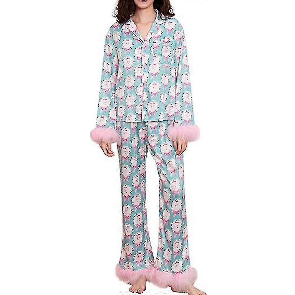 2026 Women Feather Trim Pajama Set Button Up Top Pants Lounge 2Pcs/Set Satin Pjs Sleepwear