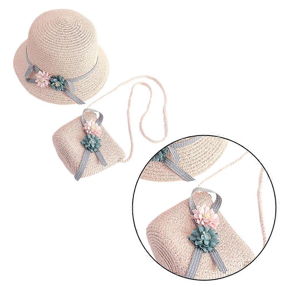 Kids Straw Hat Beach Set for Girls with Straw Crossbody Bag 1Set Pink