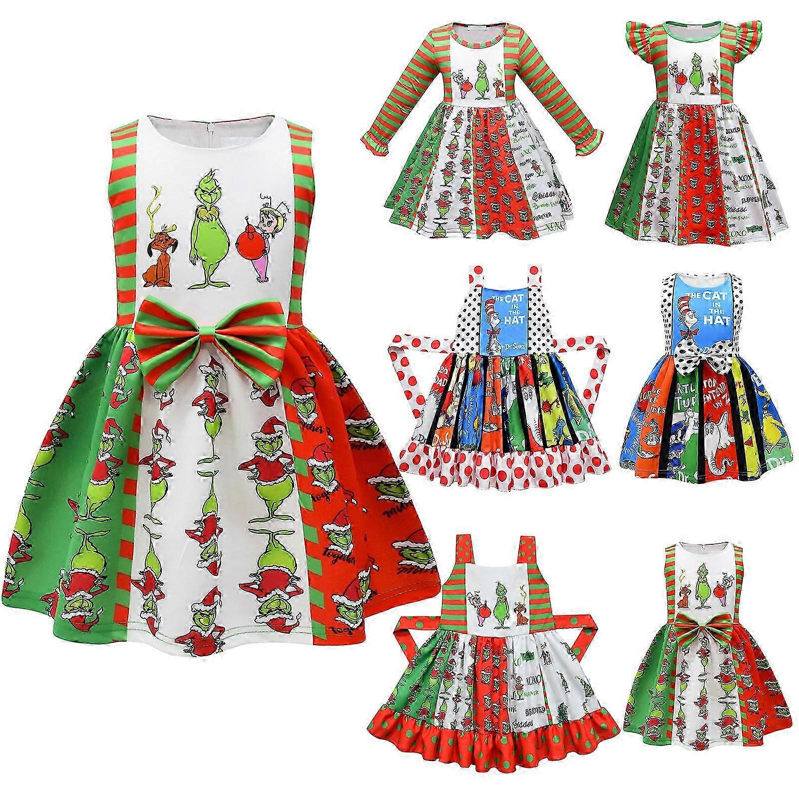 26-27 Christmas Grinch Party Dress Toddler Kids Girls Infant Flare Sleeves Cartoon Green Monster Prints Party Custome Princess Dress