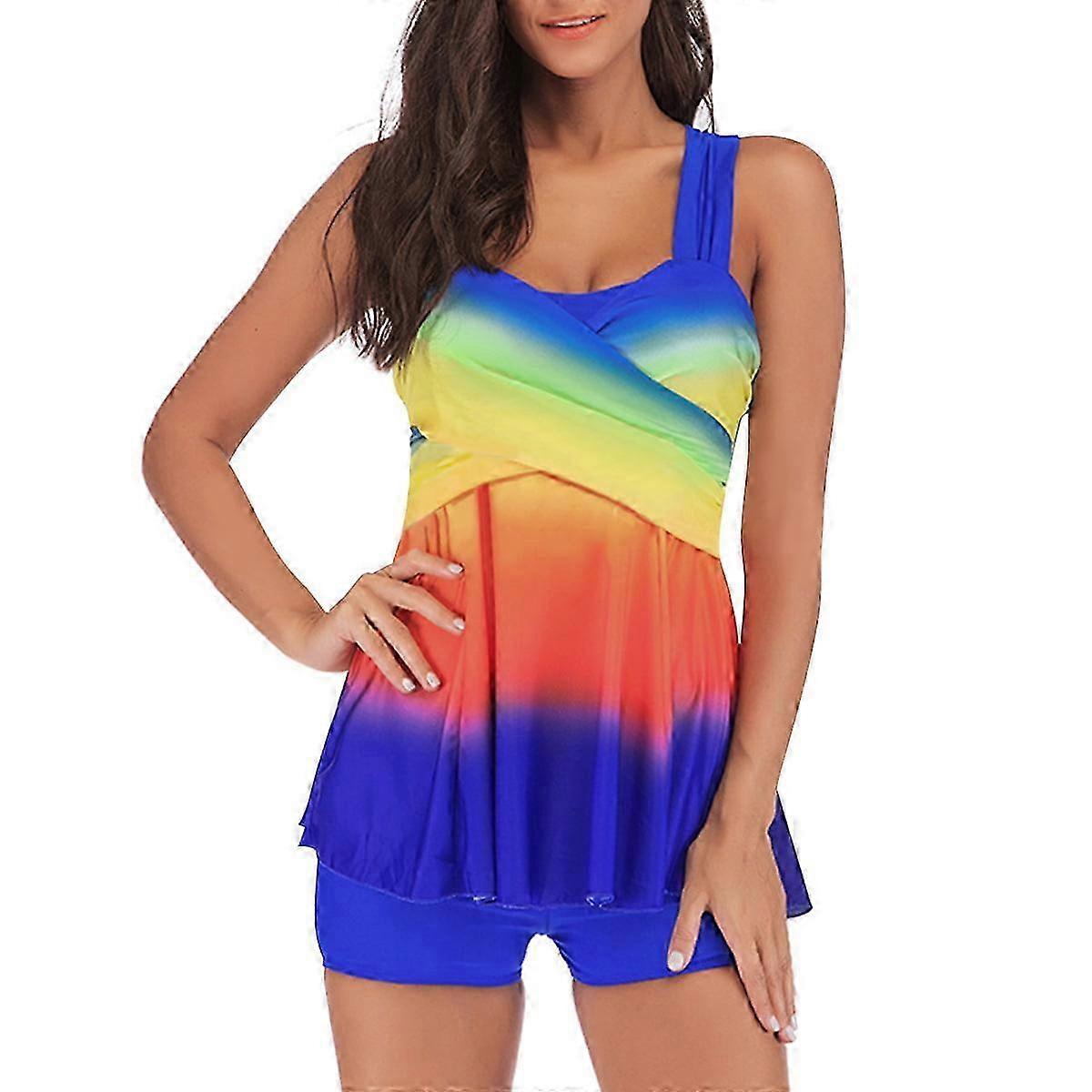 26-27 Plus Size Swimsuits For Women Tummy Control Rainbow Swimwear Two Piece Swimdress With Shorts