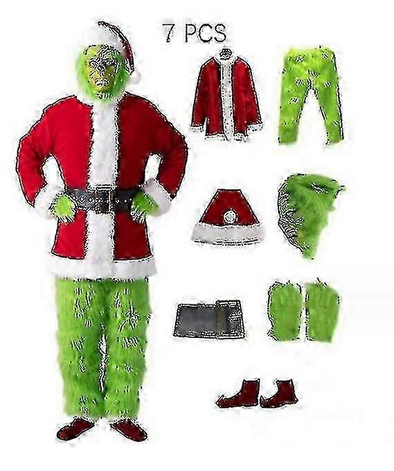 Please note that when you select (Size: Only Mask), you will only receive a mask. Please confirm your order options before making a purchase Features: MATERIALSThe garment is made of Corduroy and polyester, and Grinch mask is made of latex, making it soft and comfortable to wear. Breathable and sweat-absorption, exquisite workmanship and comfortable to wear. DESIGNSanta's long-sleeved top, belt and mask is a 7-piece Christmas costume set inspired by the movie "How the Grinch Stole Christmas," and is a must-have costume for Halloween fun. SUITABLE OCCASIONPerfect for Christmas Holiday, Halloween, Masquerade, Cosplay, Themed Parties, Stage Performance, Carnivals, School Event, Office Christmas Celebration. Deluxe furry Grinch Santa Costume 7 Pcs Set Coat, Waist belt, Green mask, Pants, Gloves, Shoe covers , Christmas hat. s: & Material: Corduroy+Polyester Size: S-3XL Great for Cosplay, Comic Exhibition, Halloween, Party, Carnival, Holiday, Book Week, Dress Up It is also a great gift for grinch lovers! Package Included: 1*Coat+1*Pants+1*Hat+1*Waist Belt+2*Gloves+2*Shoes Covers+1 * Mask Or 1*Mask Please note that when you select (Size: Only Mask), you will only receive a mask. Please confirm your order options before making a purchase Note: Due to the light and screen setting difference, the item's color may be slightly different from the pictures. Please allow slight dimension difference due to different manual measurement.