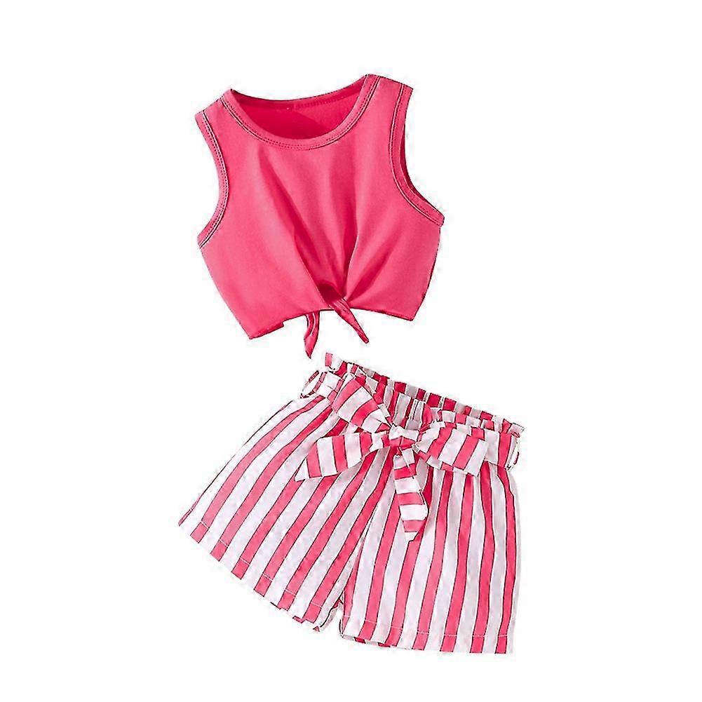 26-27 Summer 2Pcs Set Children Baby Girl Clothes Suit Sleeveless Tank Tops + Bow Decor Striped Print Shorts Outfits 4-7 Years