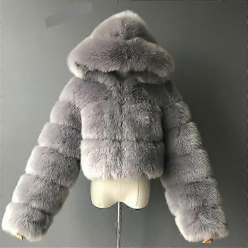 26-27 Faux Fur Women With Hood Coats Fleece Short Warm Jackets Plus Size Winter Coats For Women Grey