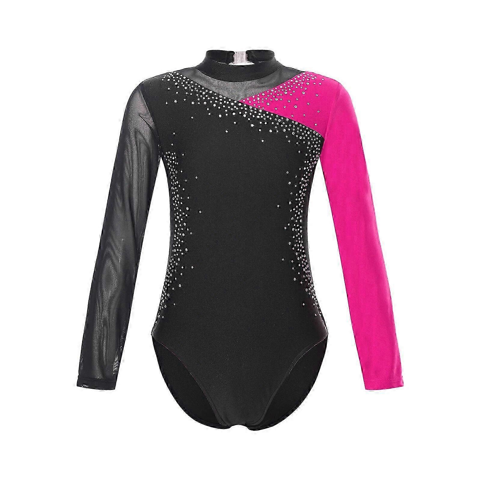 26-27 Kids Rhythmic Gymnastics Jumpsuit for Girls Teens Patchwork Ballet Dance Leotard Dancewear Long Sleeve Yoga Skating Bodysuit