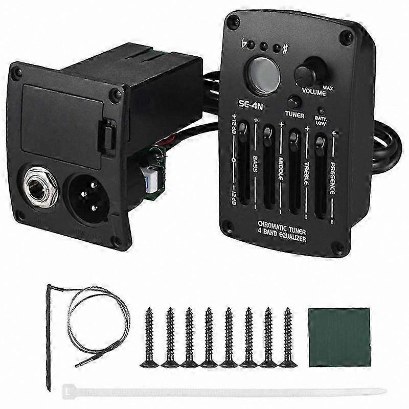 Pickup with 4-band EQ, suitable for classical and folk guitars. Bass, middle, treble, and presence control knobs. Built-in tuner with LED display. Equipped with 6.35mm and XLR output jacks for connecting to external speakers or amplifiers. Powered by one 9V battery (not included) with low battery indicator. Pickup type: Piezo Ceramic Input impedance: 10MΩ Frequency response: 20Hz–20kHz Control range: Bass: ±12dB at 60Hz, Middle: ±12dB at 650Hz, Treble: ±12dB at 2.2kHz, Presence: ±12dB at 10kHz Output: 6.35mm and XLR jacks Model number: SE-4N Type: Pickup Product name: 4-Band Acoustic Guitar Preamp Designed for: Folk Guitar Power source: 1 x 9V battery (not included) Color: Black Material: Plastic and electronic components Dimensions: 69.5 x 41.5mm Package contents: 1 x Pickup 1 x Battery box 1 x Pickup stick 1 x Clip 1 x Screw set Note: Light reflection and differences in display screens may cause slight variations between the color shown in the photo and the actual product. Measurement may vary by +/- 1-3cm.