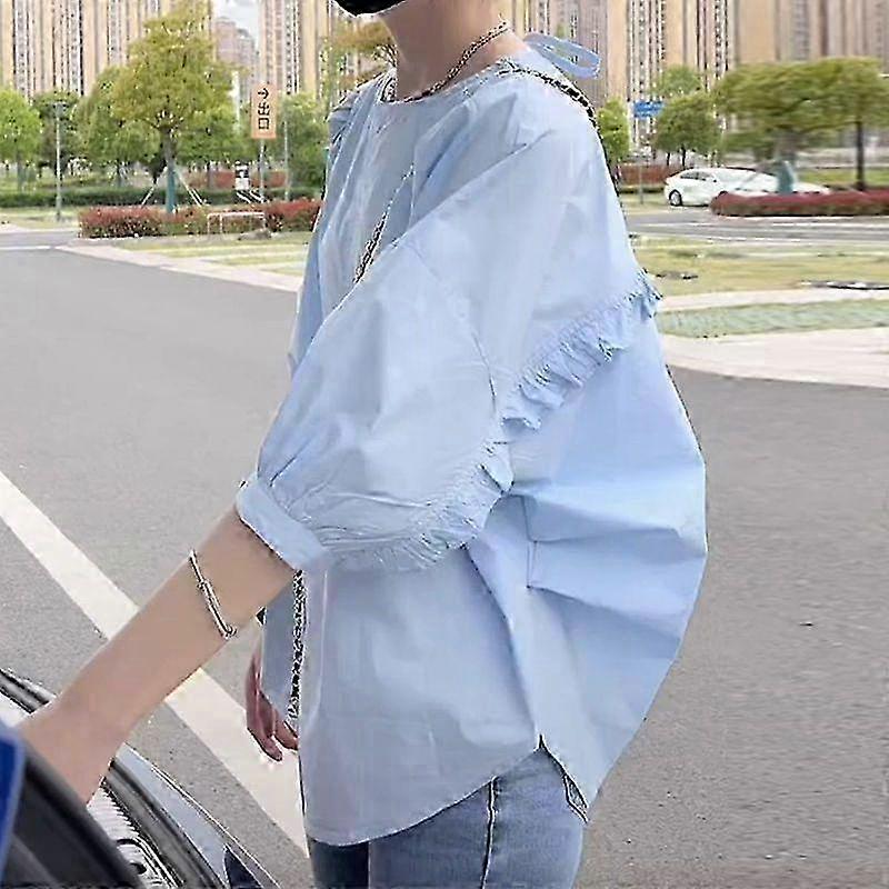 Women's White Blouse Elegant Bubble Sleeve Floral Short Sleeve Loose Fit Summer