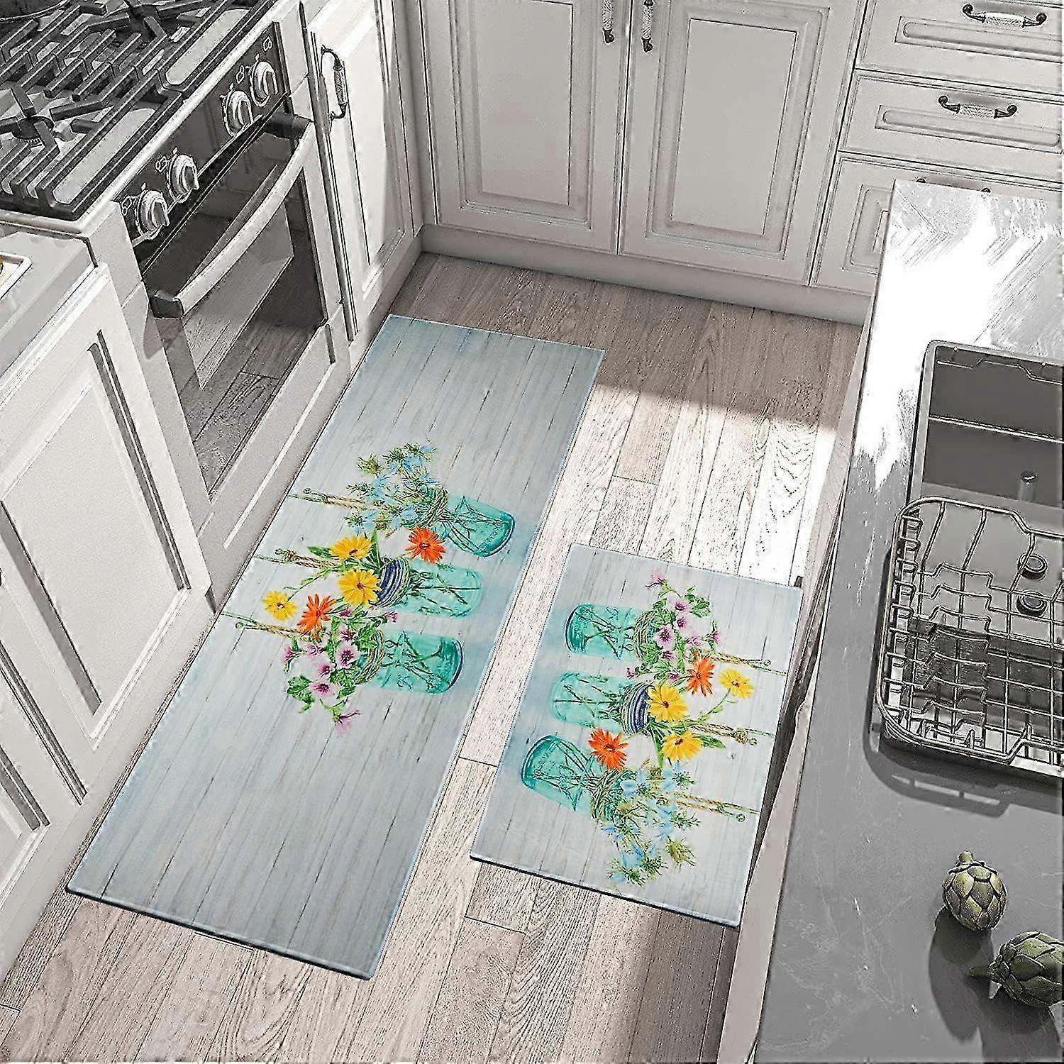 2 Piece Kitchen Rugs Set Floral Farmhouse Colorful Spring/Summer Flowers Decorative Low-Profile for Kitchen Home 17'x48'+17'x30' 26-27s