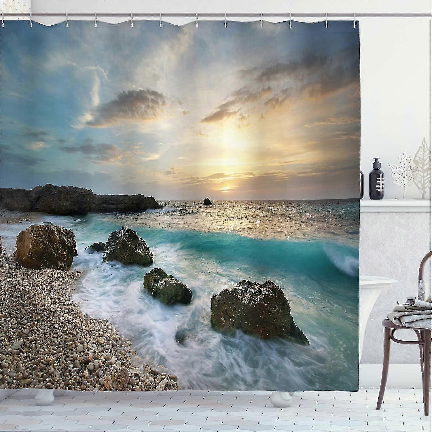 Ocean Shower Curtain, Seascape Composition Of Nature Rocks Waves Cloudy Sky Rising Sun Beach Photo, Cloth Fabric Bathroom Decor Set With Hooks,brown B