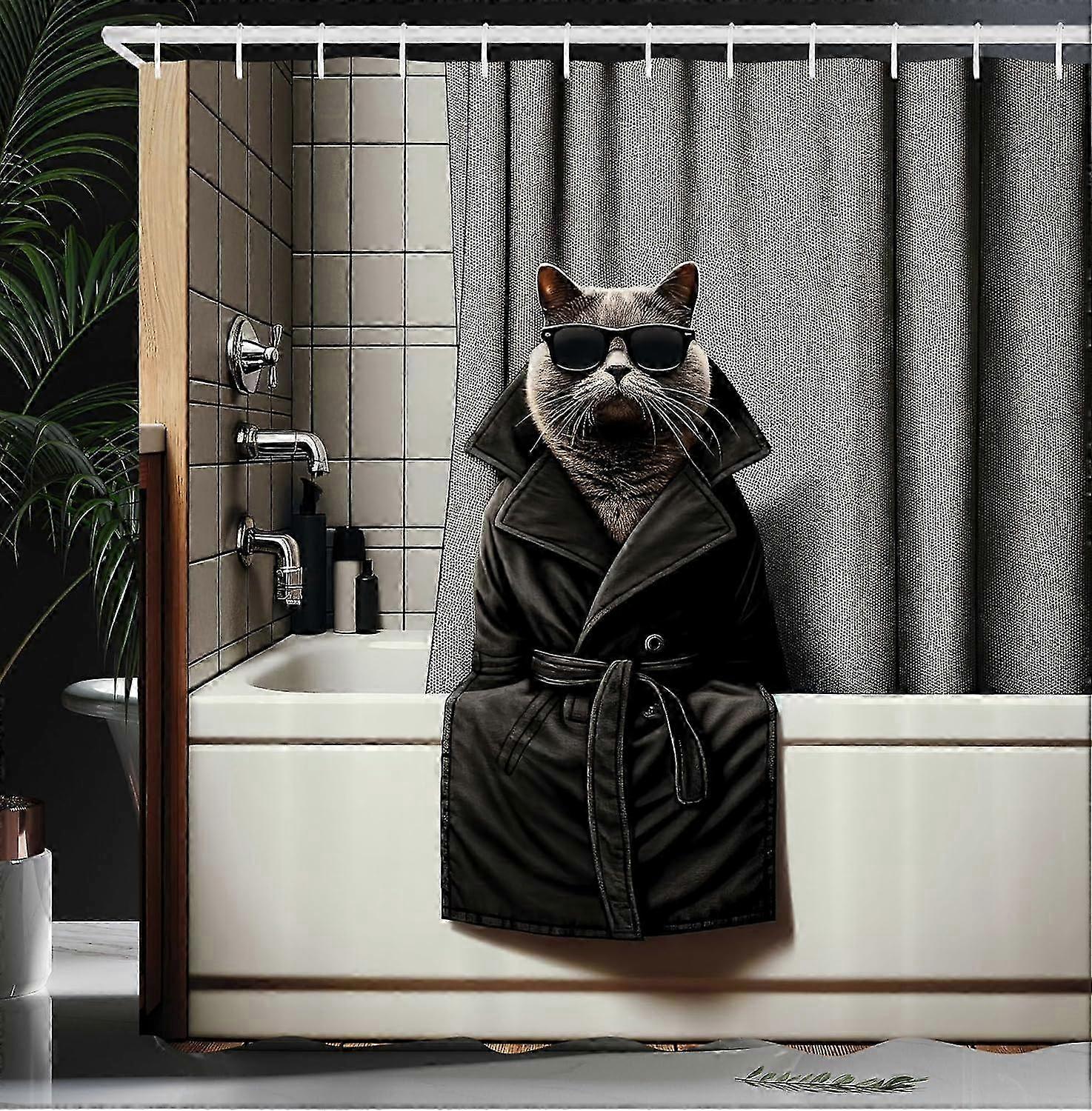 Cat Shower Curtain, Realistic Funny Mysterious Kitty In Human Coat And Black Shades In Bath Tub, Cloth Fabric Bathroom Decor Set With Hooks,grey And C