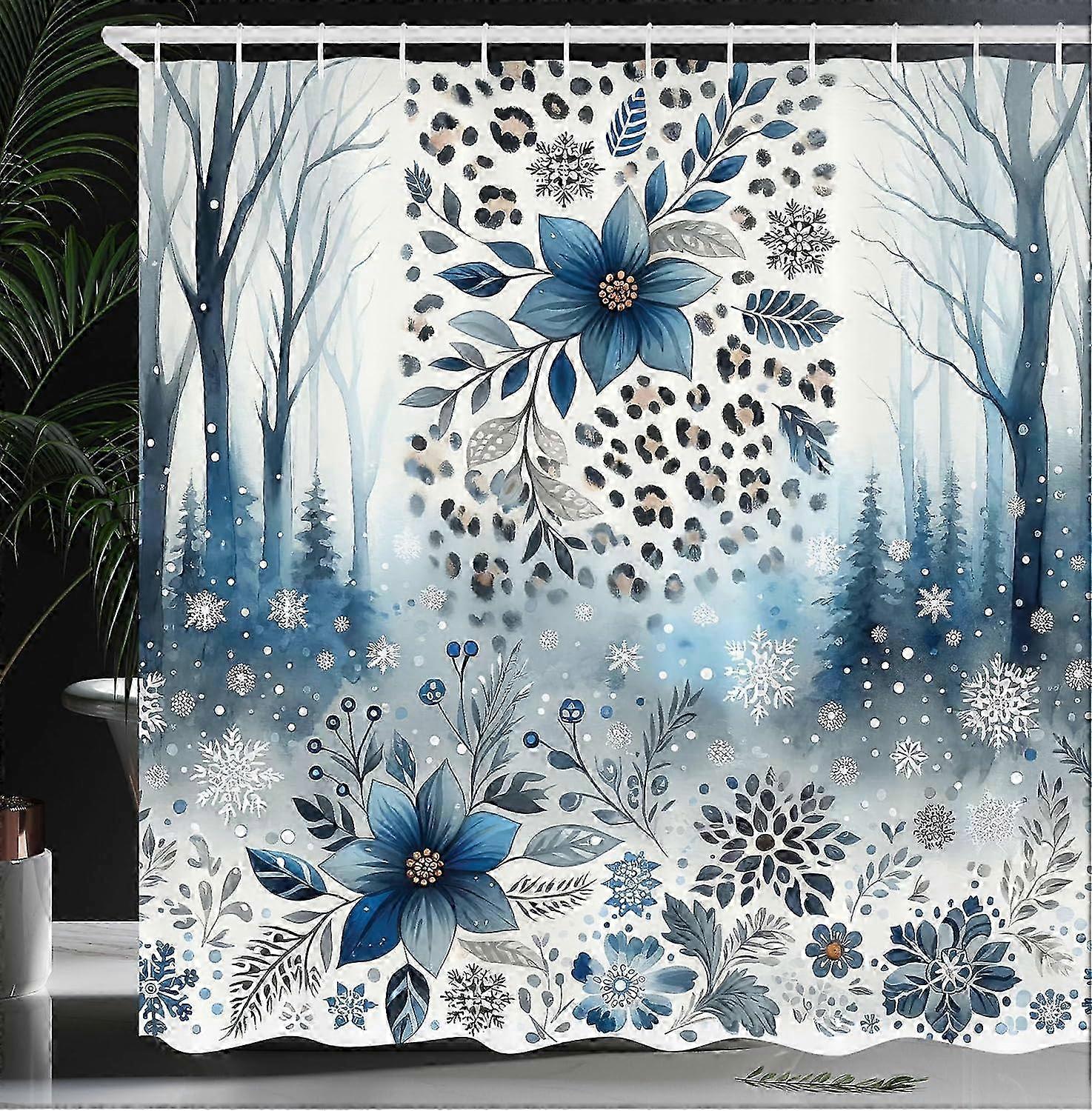 Winter Blue Shower Curtain, Snowy Woodland Frosty Flowers Snowflakes And Leopard Print, Cloth Fabric Bathroom Decor Set With Hooks,slate Blue Pale Tan