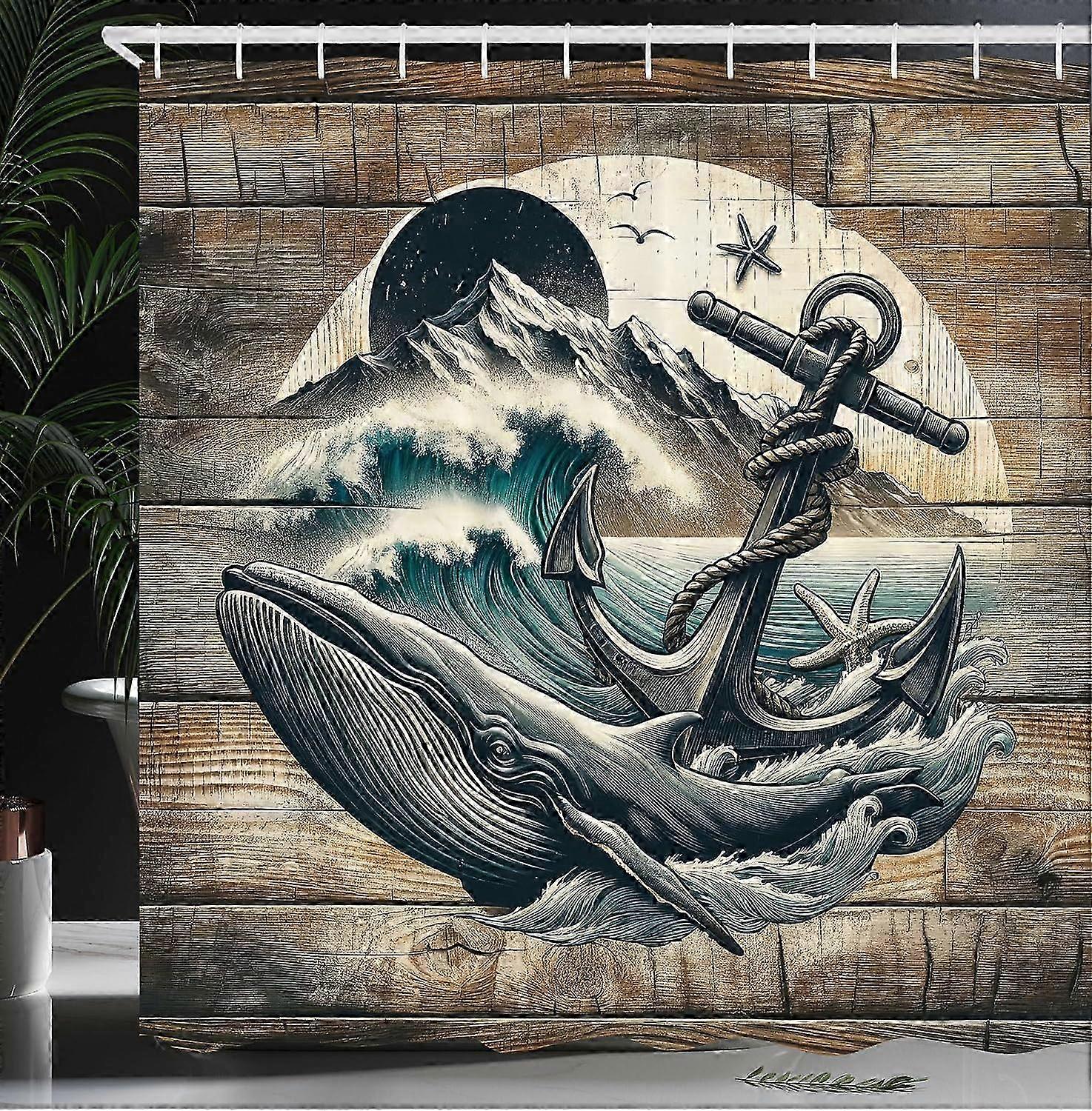 Nautical Shower Curtain, Retro Sailing Adventure Rustic Wooden Marine Cottage Anchor Whale Waves, Cloth Fabric Bathroom Decor Set With Hooks,brown And