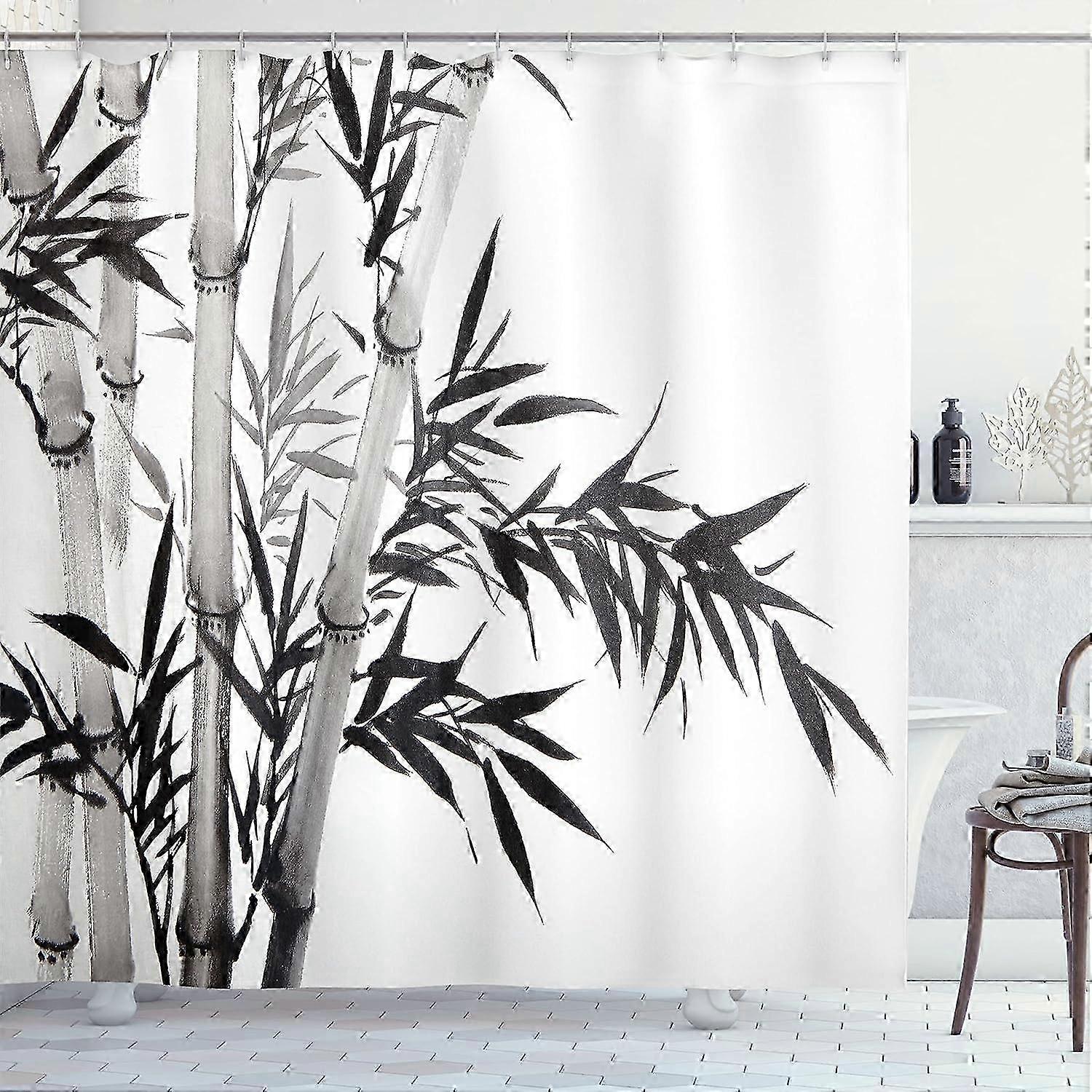 Bamboo Print Shower Curtain, Bamboo Tree Image Traditional Chinese Calligraphy Style Culture Theme, Cloth Fabric Bathroom Decor Set With Hooks,charcoa