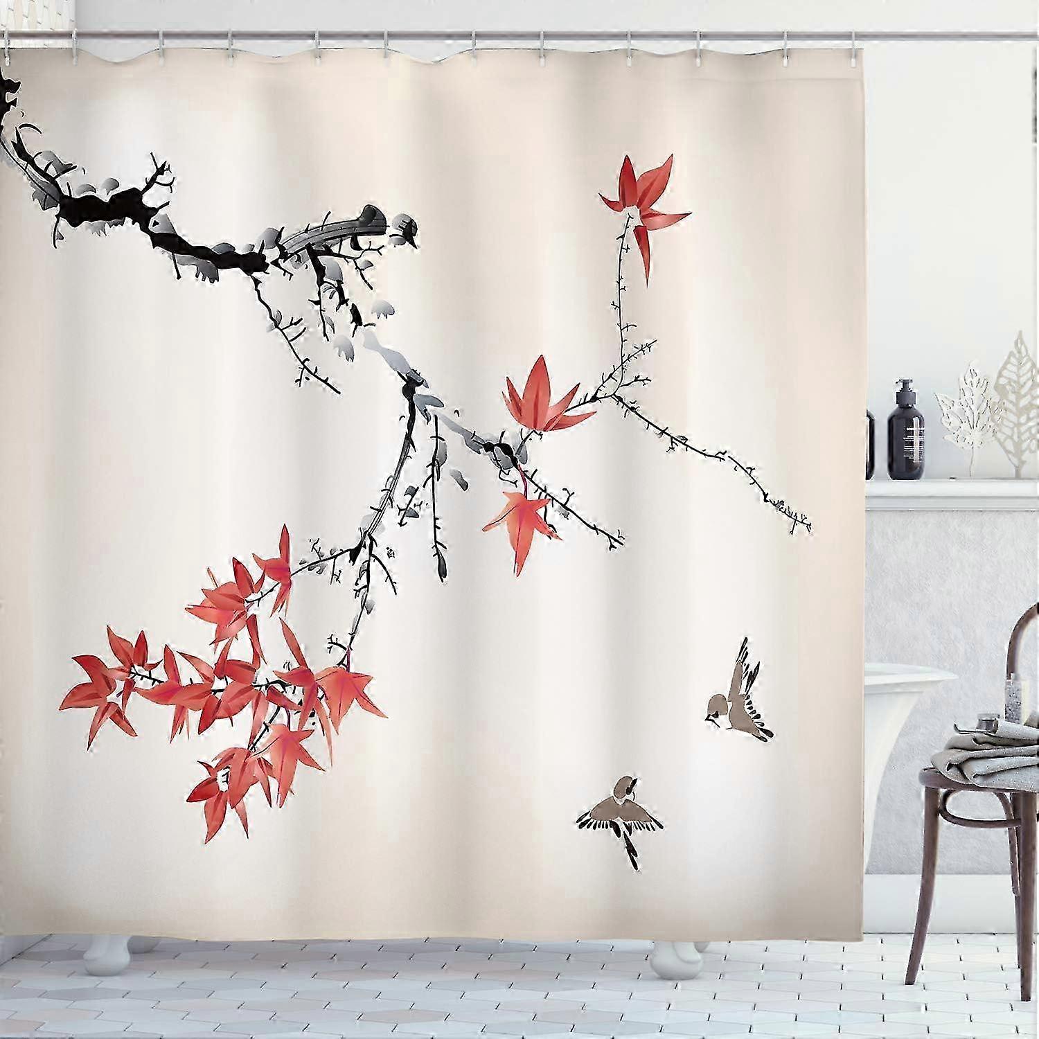 Japanese Shower Curtain, Cherry Blossom Of Sakura Tree Branches Romantic Spring Themed Watercolor Look Nature Picture Print, Fabric Bathroom Decor Set