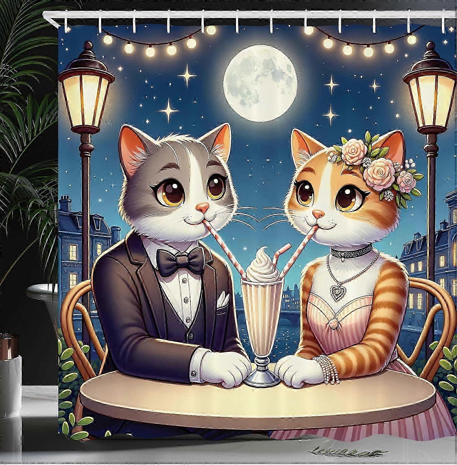 Cat Shower Curtain, Romantic Date Night Of Kitties Drinking Milkshake Cozy Night Scene Valentines, Cloth Fabric Bathroom Decor Set With Hooks,dark Blu